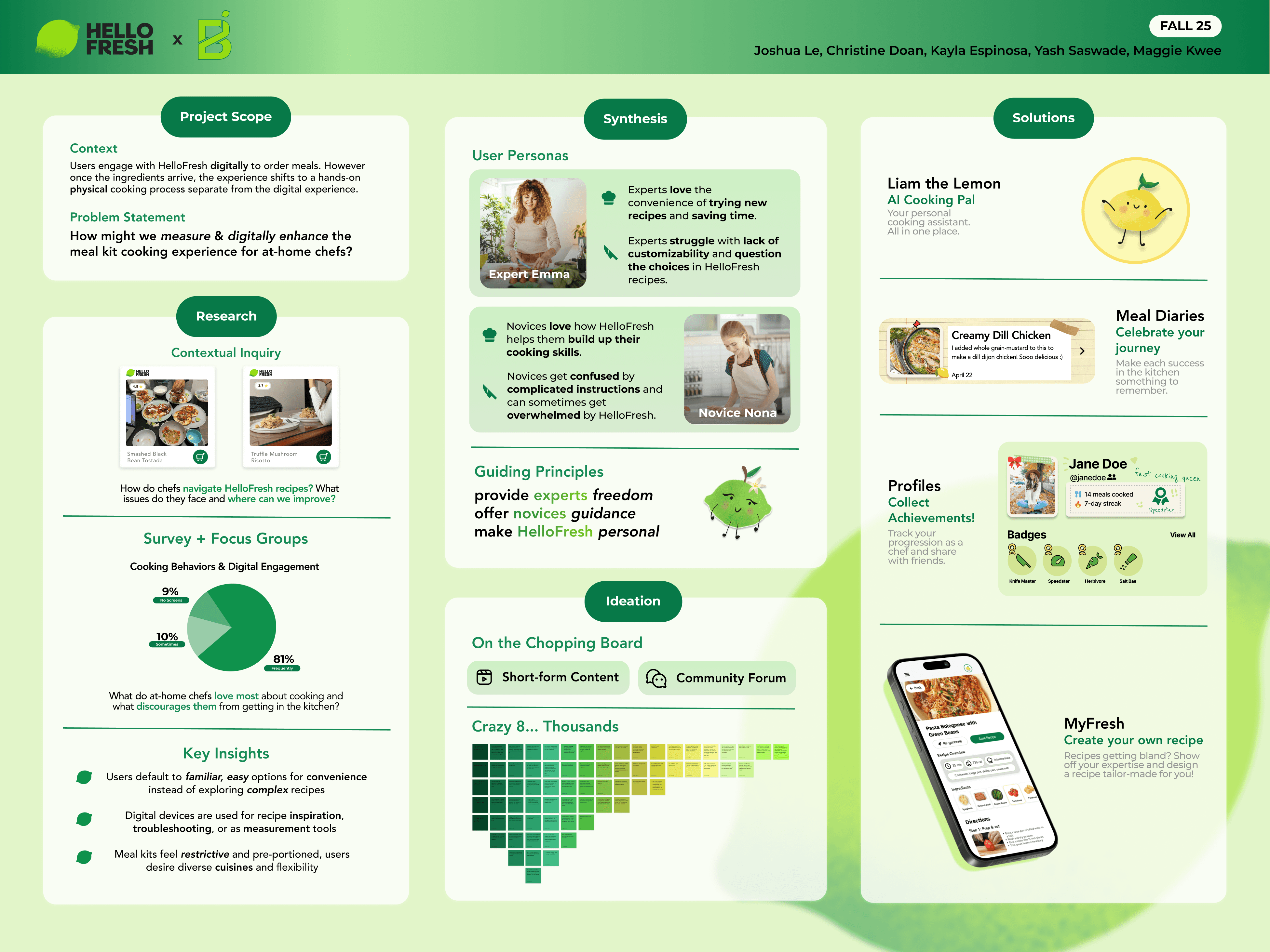 HelloFresh is a meal kit service that simplifies home cooking with pre-portioned ingredients and guided recipes. In this project, we explored how to take the physical elements of cooking and integrate digital features into the cooking process.
