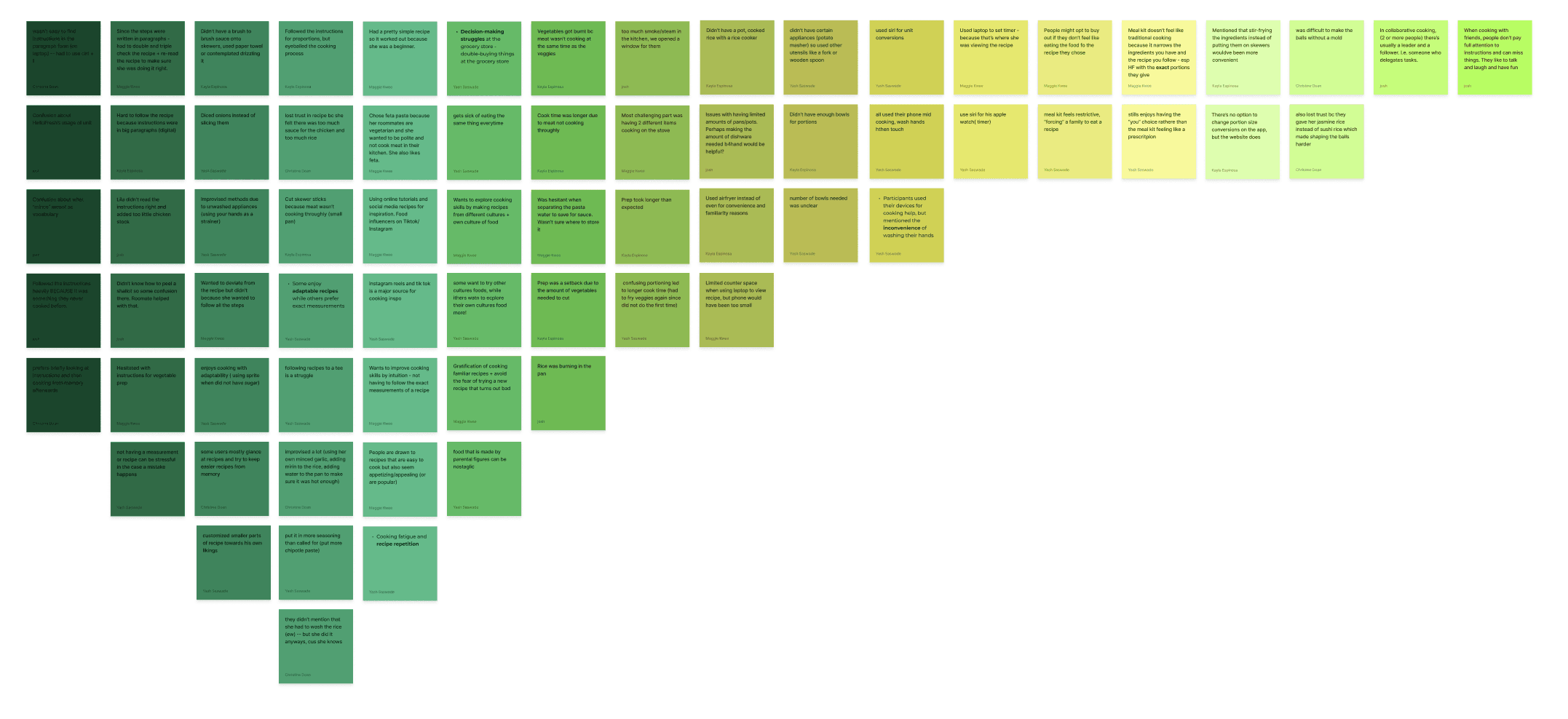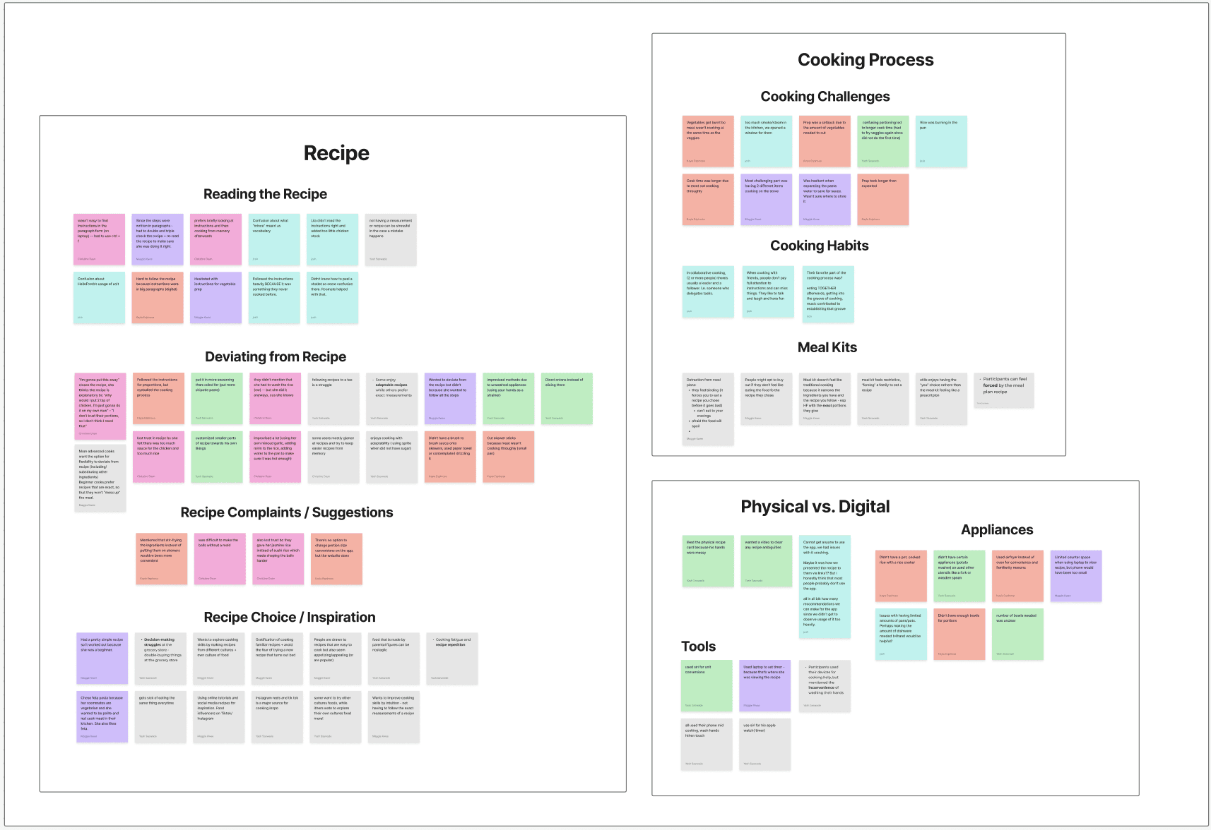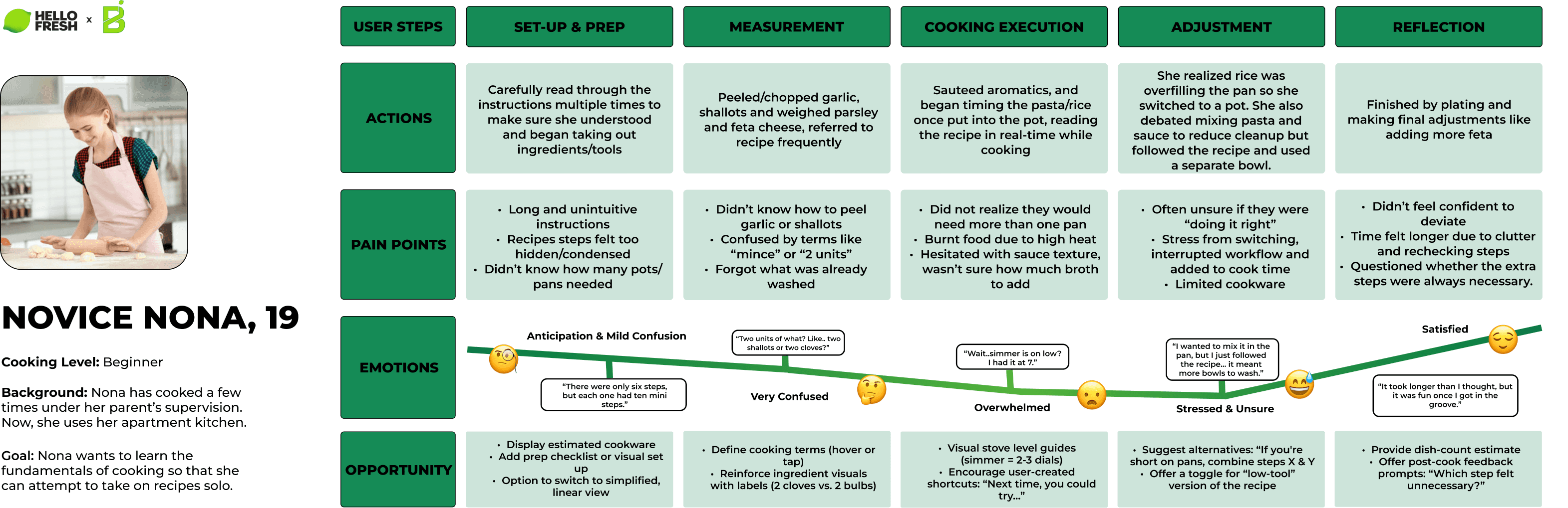 We then conducted 6 ethnographies following beginner to experienced chefs utilizing existing physical and digital HelloFresh tools. Participants were asked to think aloud, allowing us to record user habits, challenges, and motivations for their cooking behaviors and actions.